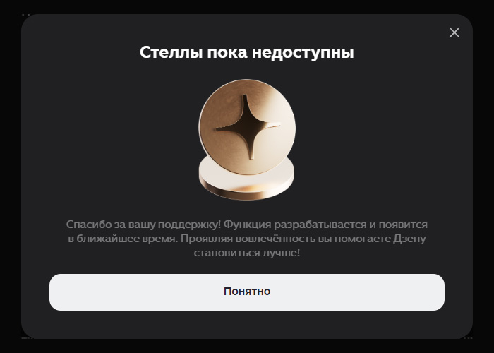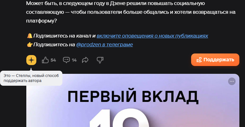 В Дзене тестируется аналог звёзд Телеграма — «Стеллы». Для тех, кто не знаном, поясню — это платный «лайк» в виде звёздочки (в случае Дзена — логотипа платформы), который отображается рядом с лайками под публикацией.