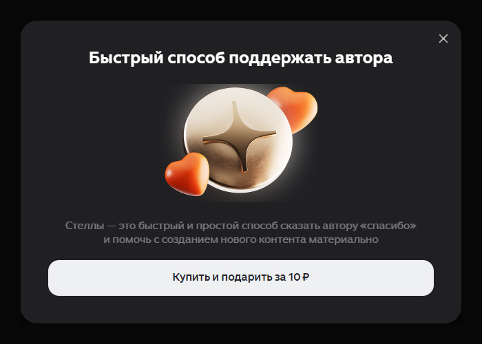 Пользователь платформы может приобрести «стеллу» и подарить её автору, и таким образом поддержать его, а также визуально подсветить свою поддержку.