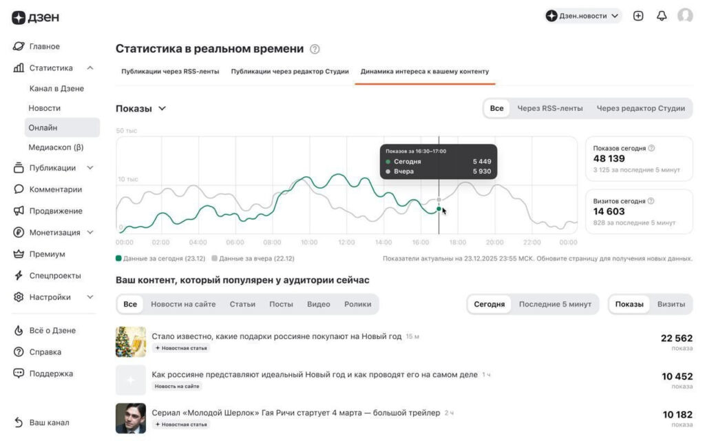 Она позволяет оценить «динамику интереса к вашему контенту»: можно сравнить трафик за вчера и сегодня, посмотреть статистику публикаций, загруженных через RSS, и отдельно — публикаций, созданных через редактор студии.