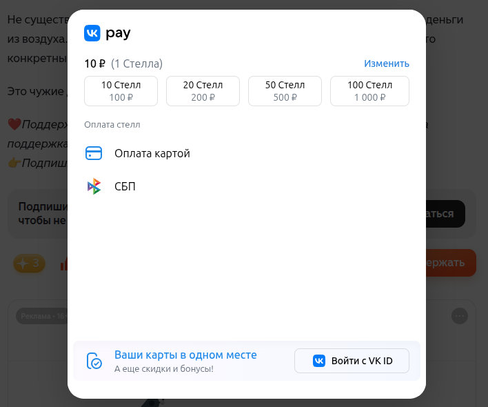 - Стоимость одной стеллы (для пользователя) — 10 рублей.